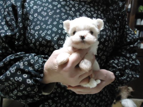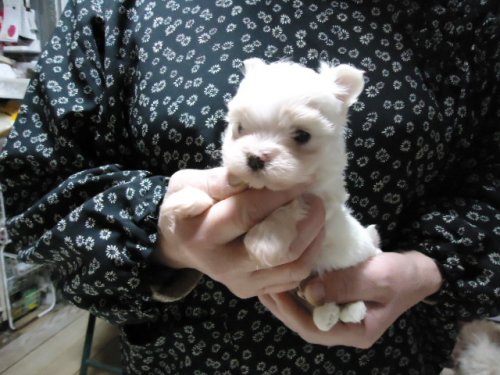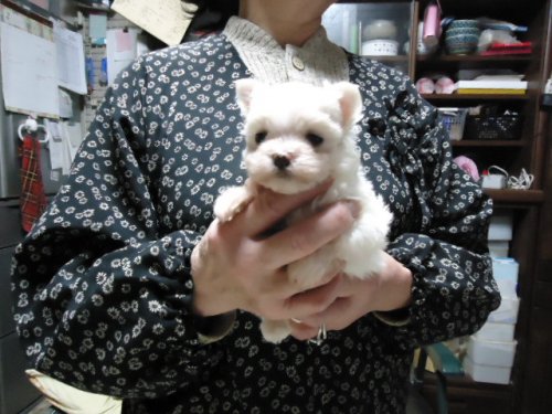 この度ご縁がありまして村島ブリーダーさんから可愛いマルチーズの男の子を譲って頂きました。犬を飼うことは初めてだったのですが2度ほど見学し、アドバイスも頂き、安心して子犬を迎えることができました。何かあれば電話でいつでも相談にのって下さるとのことで心強いです。子犬もとても元気でおトイレもすぐに覚えてとってもいい子です。ありがとうございました。(栃木県 女性)