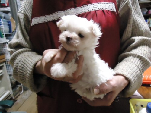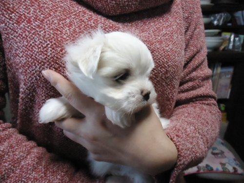 この度ご縁がありまして村島ブリーダーさんから可愛いマルチーズの男の子を譲って頂きました。犬を飼うことは初めてだったのですが2度ほど見学し、アドバイスも頂き、安心して子犬を迎えることができました。何かあれば電話でいつでも相談にのって下さるとのことで心強いです。子犬もとても元気でおトイレもすぐに覚えてとってもいい子です。ありがとうございました。(栃木県 女性)