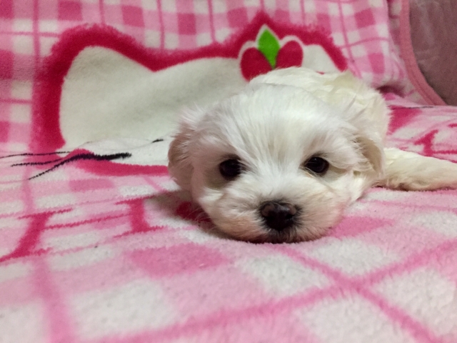 元気でよく食べよく遊ぶ、可愛い子です。ゲージに入れるとしばらく鳴いていますが、すぐ諦めて寝る本当に良い子です。 ブリーダーさんはメールの返信が少し遅いですが、質問したことには 親切に答えてくださるので聞くことを迷うことはありません。心強いです。(大阪府 女性)