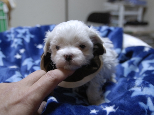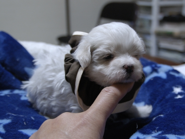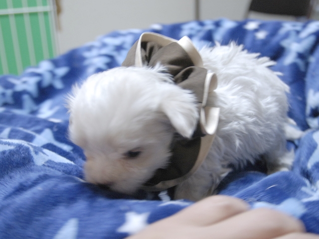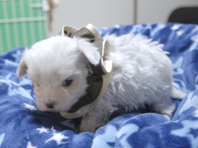 コメント | 3人兄妹の男の子です。 お父さんはビアンココです。 お母さんはコロンちゃんです。(茶リボン君) ぜひご見学にお越しください。 見てびっくりのかわいさです! 現時点では欠点は見当たりません。 |