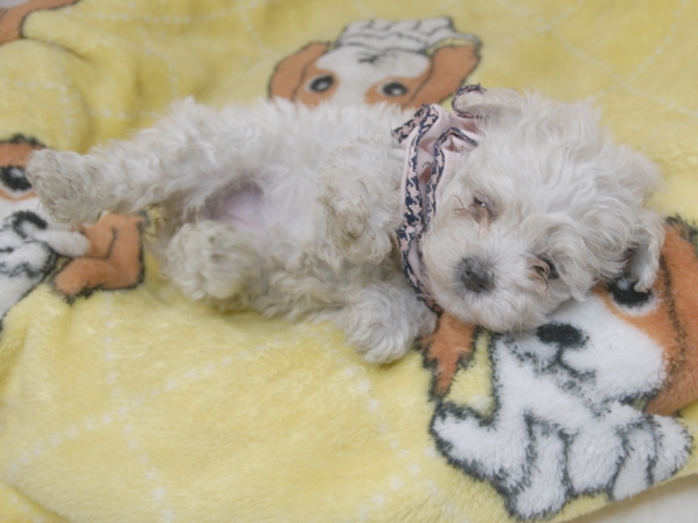 この度はとっても元気な子をありがとうございました。 見学の際は駅まで迎えにきていただき、説明もとても丁寧で安心しました。 空輸で送っていただき、ありがとうございました。 迎えてから一週間が経ち、家にも慣れて、へそ天で寝ています。 トイレトレーニングも、来た時から8割できていて、今ではほとんど失敗しなくなりました。 可愛く元気で、毎日元気に飛び跳ねています。(奈良県 女性)