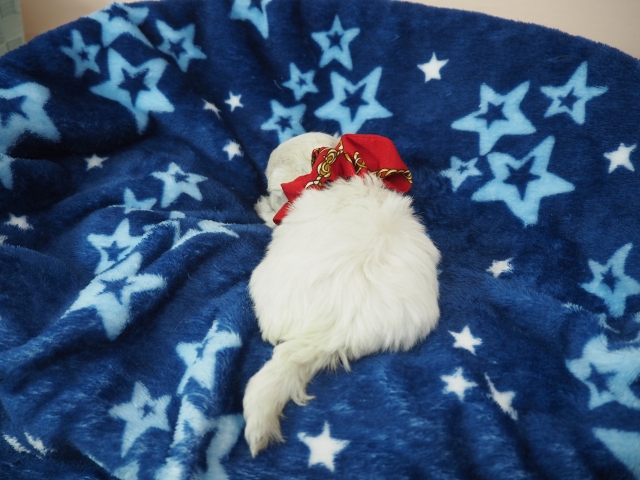 この度はとっても元気な子をありがとうございました。 見学の際は駅まで迎えにきていただき、説明もとても丁寧で安心しました。 空輸で送っていただき、ありがとうございました。 迎えてから一週間が経ち、家にも慣れて、へそ天で寝ています。 トイレトレーニングも、来た時から8割できていて、今ではほとんど失敗しなくなりました。 可愛く元気で、毎日元気に飛び跳ねています。(奈良県 女性)