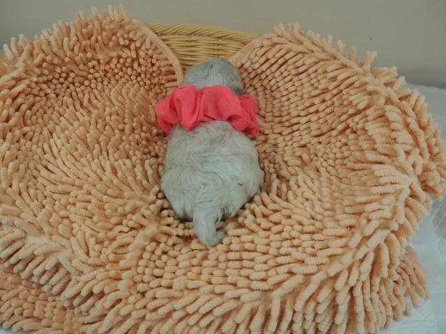 この度はとっても元気な子をありがとうございました。 見学の際は駅まで迎えにきていただき、説明もとても丁寧で安心しました。 空輸で送っていただき、ありがとうございました。 迎えてから一週間が経ち、家にも慣れて、へそ天で寝ています。 トイレトレーニングも、来た時から8割できていて、今ではほとんど失敗しなくなりました。 可愛く元気で、毎日元気に飛び跳ねています。(奈良県 女性)