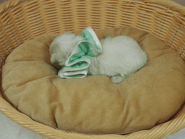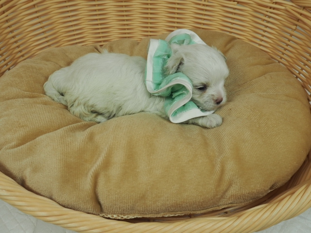 この度はとっても元気な子をありがとうございました。 見学の際は駅まで迎えにきていただき、説明もとても丁寧で安心しました。 空輸で送っていただき、ありがとうございました。 迎えてから一週間が経ち、家にも慣れて、へそ天で寝ています。 トイレトレーニングも、来た時から8割できていて、今ではほとんど失敗しなくなりました。 可愛く元気で、毎日元気に飛び跳ねています。(奈良県 女性)