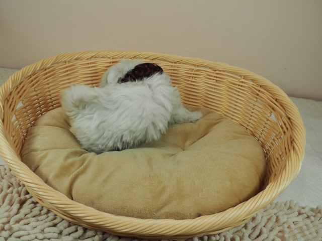 この度はとっても元気な子をありがとうございました。 見学の際は駅まで迎えにきていただき、説明もとても丁寧で安心しました。 空輸で送っていただき、ありがとうございました。 迎えてから一週間が経ち、家にも慣れて、へそ天で寝ています。 トイレトレーニングも、来た時から8割できていて、今ではほとんど失敗しなくなりました。 可愛く元気で、毎日元気に飛び跳ねています。(奈良県 女性)