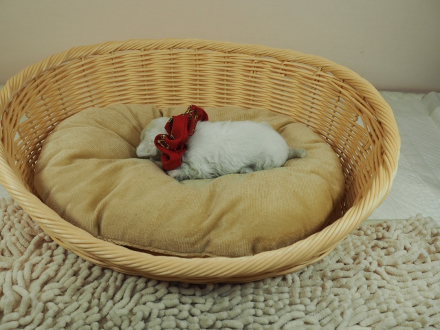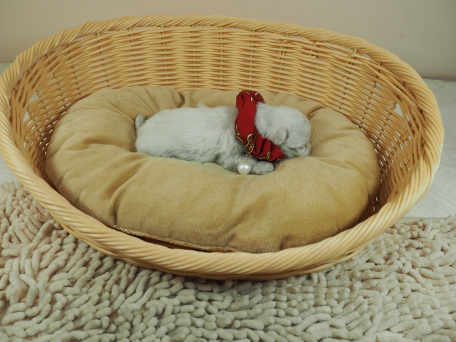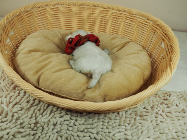 この度はとっても元気な子をありがとうございました。 見学の際は駅まで迎えにきていただき、説明もとても丁寧で安心しました。 空輸で送っていただき、ありがとうございました。 迎えてから一週間が経ち、家にも慣れて、へそ天で寝ています。 トイレトレーニングも、来た時から8割できていて、今ではほとんど失敗しなくなりました。 可愛く元気で、毎日元気に飛び跳ねています。(奈良県 女性)