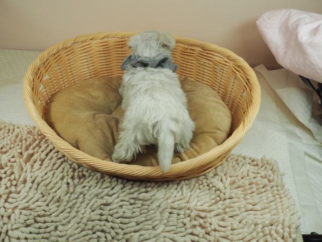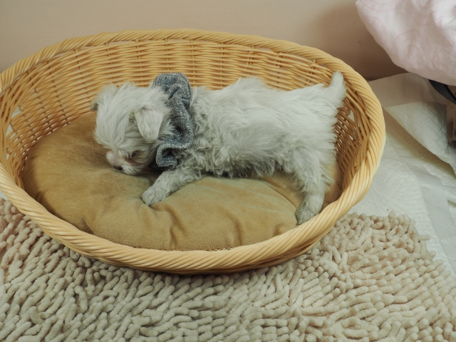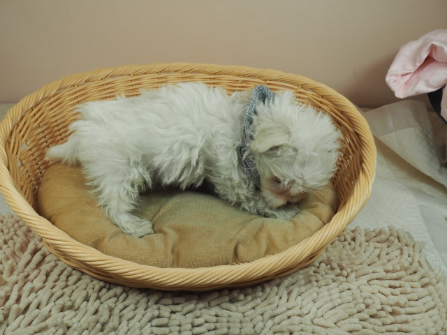 この度はとっても元気な子をありがとうございました。 見学の際は駅まで迎えにきていただき、説明もとても丁寧で安心しました。 空輸で送っていただき、ありがとうございました。 迎えてから一週間が経ち、家にも慣れて、へそ天で寝ています。 トイレトレーニングも、来た時から8割できていて、今ではほとんど失敗しなくなりました。 可愛く元気で、毎日元気に飛び跳ねています。(奈良県 女性)