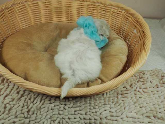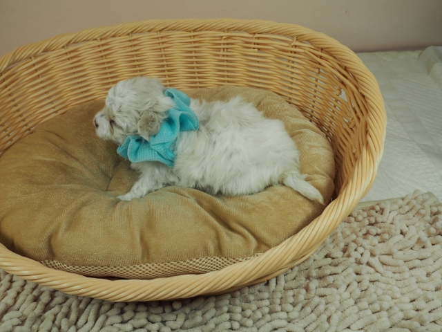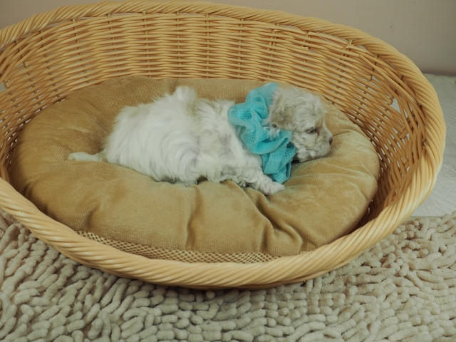 この度はとっても元気な子をありがとうございました。 見学の際は駅まで迎えにきていただき、説明もとても丁寧で安心しました。 空輸で送っていただき、ありがとうございました。 迎えてから一週間が経ち、家にも慣れて、へそ天で寝ています。 トイレトレーニングも、来た時から8割できていて、今ではほとんど失敗しなくなりました。 可愛く元気で、毎日元気に飛び跳ねています。(奈良県 女性)