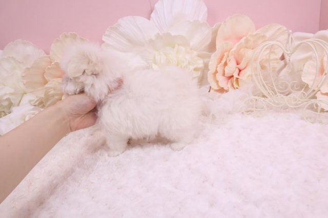 コメント | 3月4日撮影 もこもこふわふわで くりっくりの大きなお目めで お鼻もかなり短く、キティちゃんのような まんまるなお顔でとっても可愛い子です!!! もちろん手足もかなり短く、胴も短いです。 性格はマイペースなおとなしいタイプです。 3月4日現在 生後71日で体重440gです。 成犬時予想体重は1.2~1.5kg前後の~超極小サイズ予想です。 父 1.6kg 母1.7kg 1回目のワクチンは6種接種済みです。 |