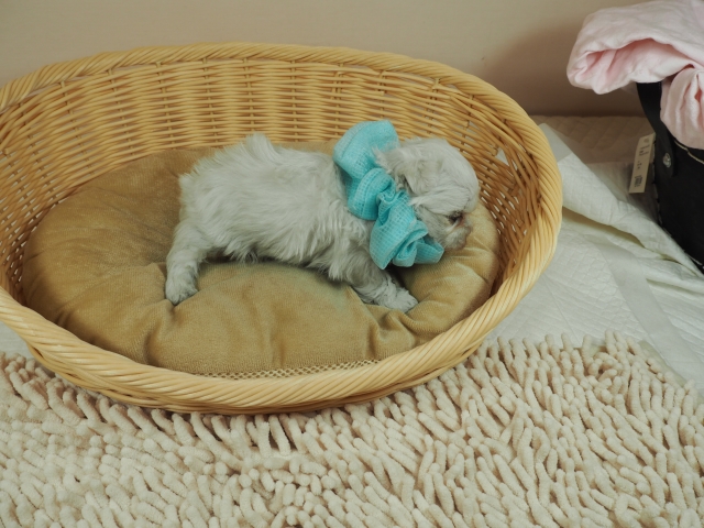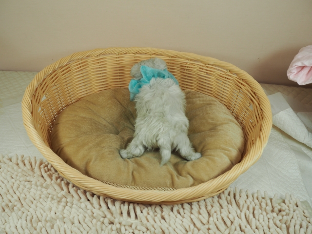 この度はとっても元気な子をありがとうございました。 見学の際は駅まで迎えにきていただき、説明もとても丁寧で安心しました。 空輸で送っていただき、ありがとうございました。 迎えてから一週間が経ち、家にも慣れて、へそ天で寝ています。 トイレトレーニングも、来た時から8割できていて、今ではほとんど失敗しなくなりました。 可愛く元気で、毎日元気に飛び跳ねています。(奈良県 女性)