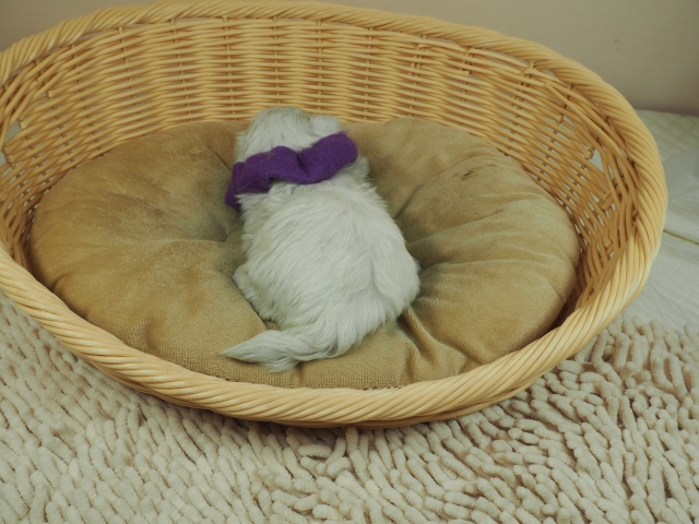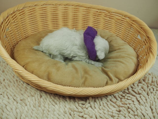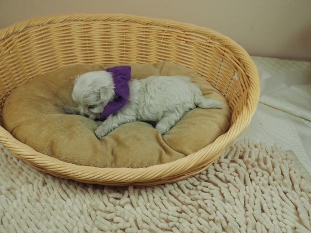 この度はとっても元気な子をありがとうございました。 見学の際は駅まで迎えにきていただき、説明もとても丁寧で安心しました。 空輸で送っていただき、ありがとうございました。 迎えてから一週間が経ち、家にも慣れて、へそ天で寝ています。 トイレトレーニングも、来た時から8割できていて、今ではほとんど失敗しなくなりました。 可愛く元気で、毎日元気に飛び跳ねています。(奈良県 女性)