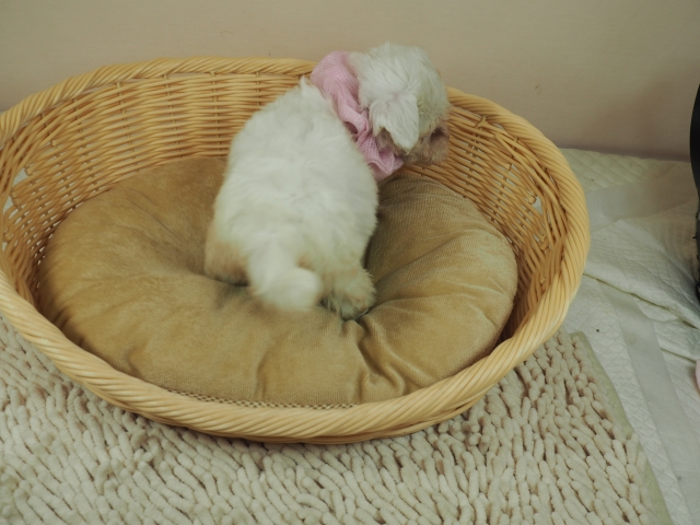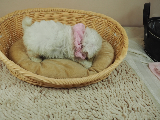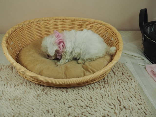 この度はとっても元気な子をありがとうございました。 見学の際は駅まで迎えにきていただき、説明もとても丁寧で安心しました。 空輸で送っていただき、ありがとうございました。 迎えてから一週間が経ち、家にも慣れて、へそ天で寝ています。 トイレトレーニングも、来た時から8割できていて、今ではほとんど失敗しなくなりました。 可愛く元気で、毎日元気に飛び跳ねています。(奈良県 女性)