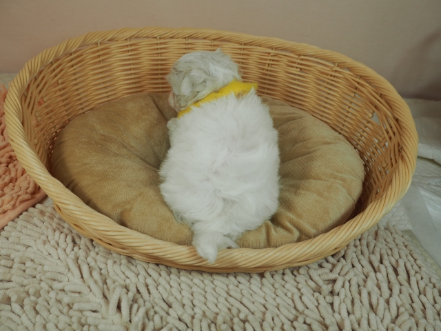 この度はとっても元気な子をありがとうございました。 見学の際は駅まで迎えにきていただき、説明もとても丁寧で安心しました。 空輸で送っていただき、ありがとうございました。 迎えてから一週間が経ち、家にも慣れて、へそ天で寝ています。 トイレトレーニングも、来た時から8割できていて、今ではほとんど失敗しなくなりました。 可愛く元気で、毎日元気に飛び跳ねています。(奈良県 女性)