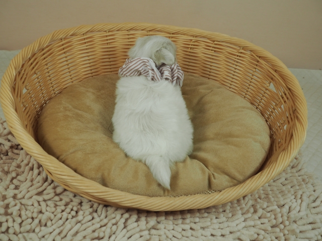 この度はとっても元気な子をありがとうございました。 見学の際は駅まで迎えにきていただき、説明もとても丁寧で安心しました。 空輸で送っていただき、ありがとうございました。 迎えてから一週間が経ち、家にも慣れて、へそ天で寝ています。 トイレトレーニングも、来た時から8割できていて、今ではほとんど失敗しなくなりました。 可愛く元気で、毎日元気に飛び跳ねています。(奈良県 女性)